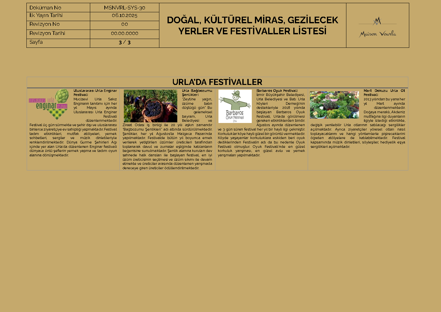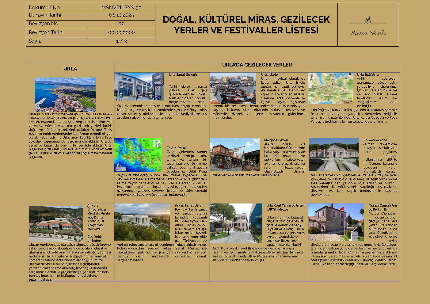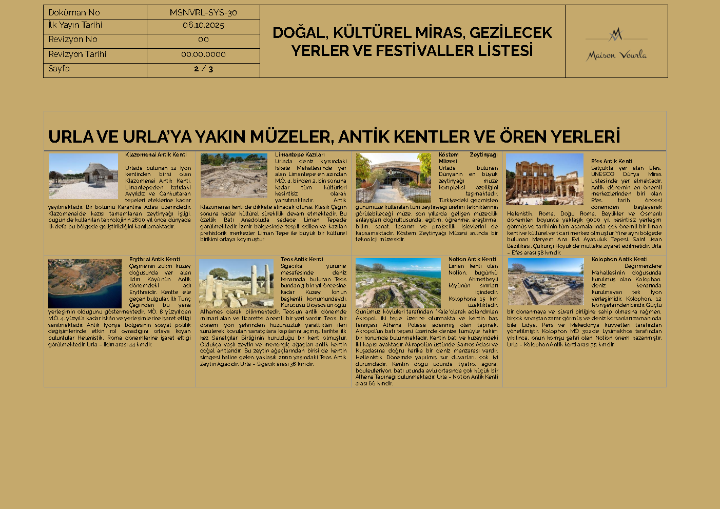 İzmir merkezinden 30 km ve İzmir Adnan Menderes Hava Limanından yaklaşık 50 km uzaklıkta, Urla’nın İskele mahallesinde bulunan Maison Vourla Hotel, bir aile işletmesi olup, Urla civarında konaklamak için ideal bir seçimdir. İskele marinasından sadece 5 dakika yürüme mesafesinde olan Maison Vourla, mükemmel merkezi konumu ve otobandan ulaşım kolaylığı sağlayarak, ister iş, ister tatil, ister sadece dinlenmek ve tarihi yerleri gezmek için, gelen misafirlerine şık ve sempatik tesisinde eşsiz kalitede hizmet sunmaktadır.